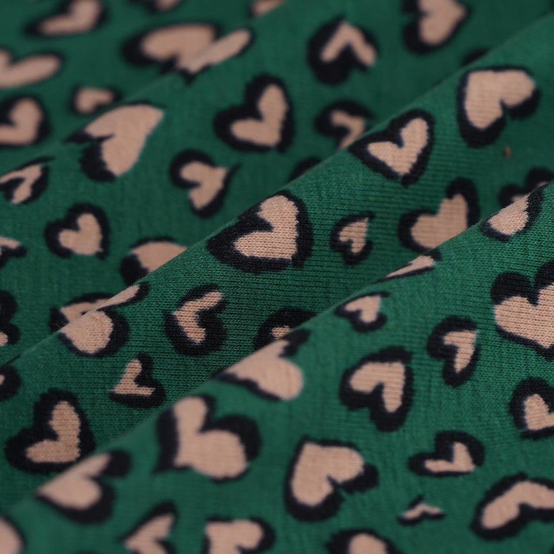 Wir sind begeistert von diesem süßen Baumwoll-Jersey mit Elasthan, bedruckt mit kleinen rosa Herzen auf grünem Hintergrund. Wir lassen unserer Fantasie freien Lauf und haben Spaß daran, Oberteile, Sweatshirts, Kleider, Leggings, T-Shirts, kleine Westen, Pyjamas und vieles mehr zu kreieren… zum Glück unserer Kinder. Unser Tipp: Verwenden Sie eine spezielle Nähmaschinennadel für Jersey-Stoffe.