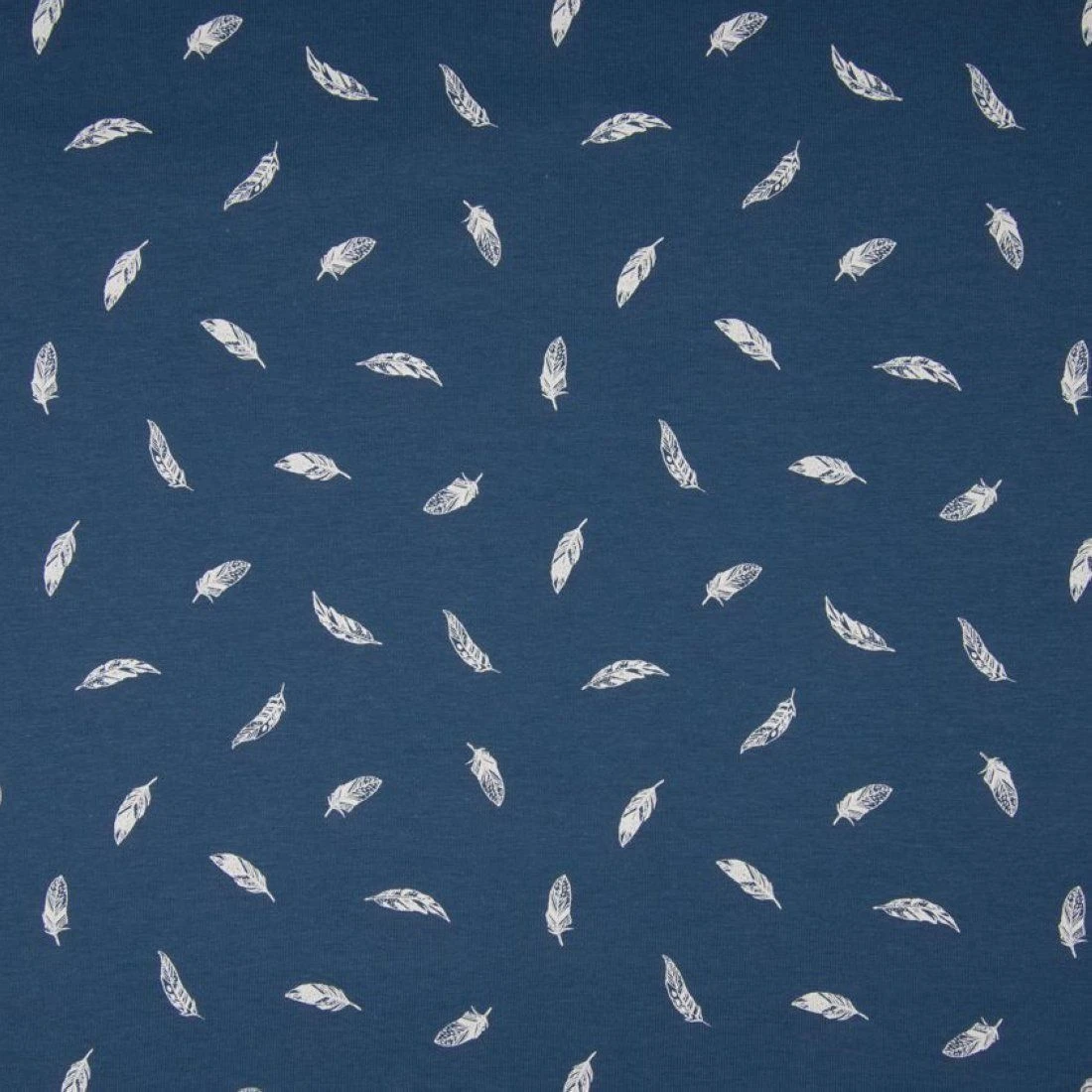 Baumwolljersey mit weißen Federn auf blauem Hintergrund. Dieser Stoff ist ein Strickstoff, der für die Herstellung von T-Shirts verwendet wird. Sie können es auch zur Herstellung von Röcken oder Kleidern verwenden. Zögern Sie nicht, Ihre T-Shirts durch Hinzufügen von Spitze, einer kleinen Tasche oder Knöpfen individuell zu gestalten.