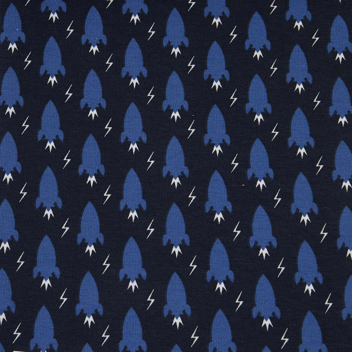 Entdecken Sie den Baumwoll-Jersey-Stoff mit Raketenmotiv, ein Muss für Ihre Kleidungskreationen! Mit seiner eleganten blau-schwarzen Farbe eignet sich dieser Stoff perfekt für die Herstellung von Kleidern, T-Shirts, Tops und sogar Sportbekleidung. Seine Zusammensetzung aus 94% Baumwolle und 6% Elasthan sorgt für optimalen Komfort. Wählen Sie diesen Baumwoll-Jersey-Stoff mit Raketenmotiv, um Outfits zu kreieren, die Komfort und Eleganz in jeder Situation vereinen!