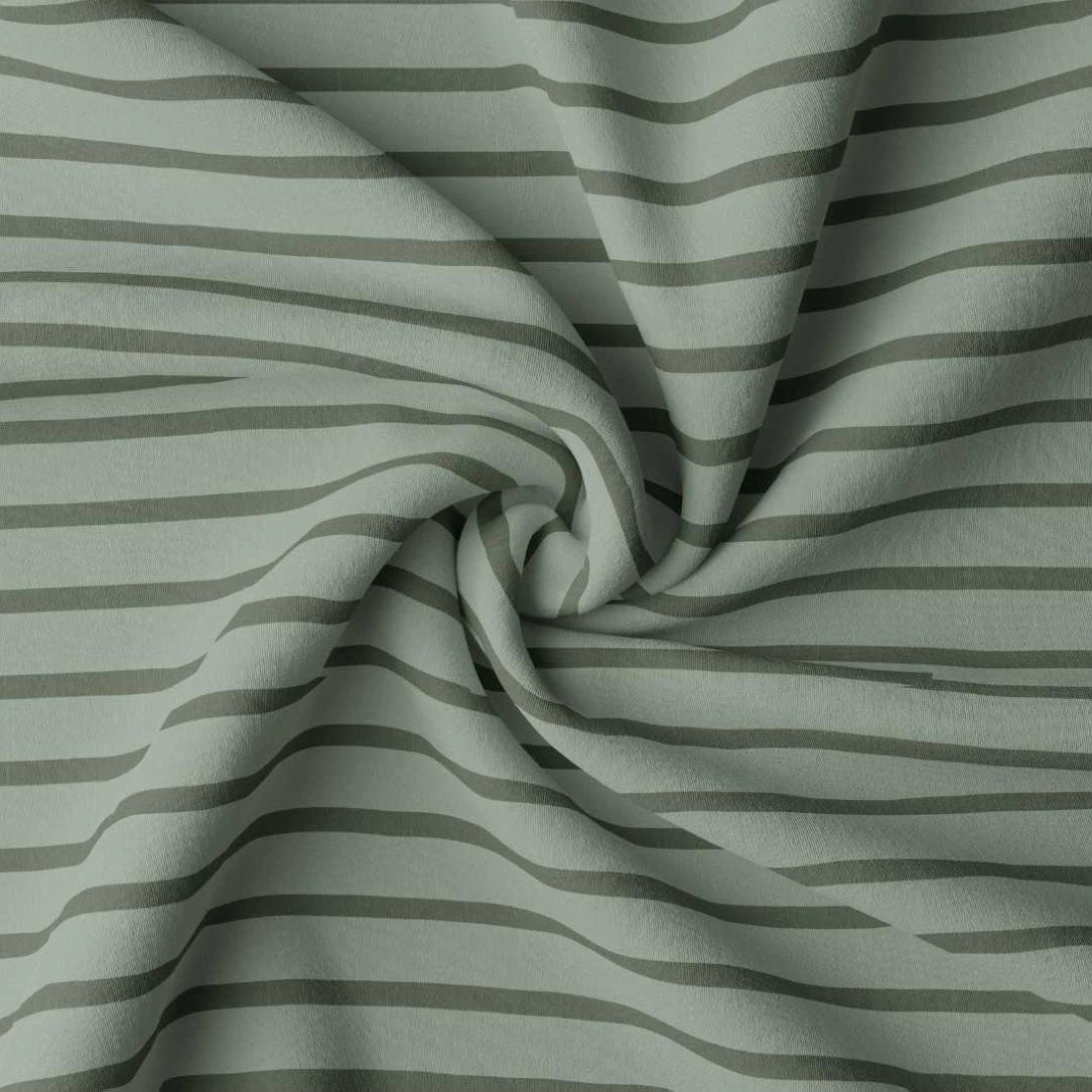 Wir freuen uns, Ihnen unseren neuen Jersey-Strickstoff aus Baumwolle mit Druck in Mandelgrün und Dunkelgrün vorzustellen. Dieser Stoff ist zertifiziert und besteht zu 96% aus Baumwolle und zu 4% aus Elasthan, was ihn sowohl weich als auch dehnbar macht für optimalen Komfort.