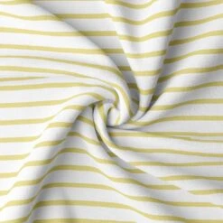 Wir freuen uns, Ihnen unseren neuen Jersey-Strickstoff aus bedruckter Baumwolle mit Vanille- und Weißstreifen vorzustellen. Dieser Stoff ist zertifiziert und besteht zu 96% aus Baumwolle und zu 4% aus Elasthan, was ihn sowohl weich als auch dehnbar für optimalen Komfort macht.