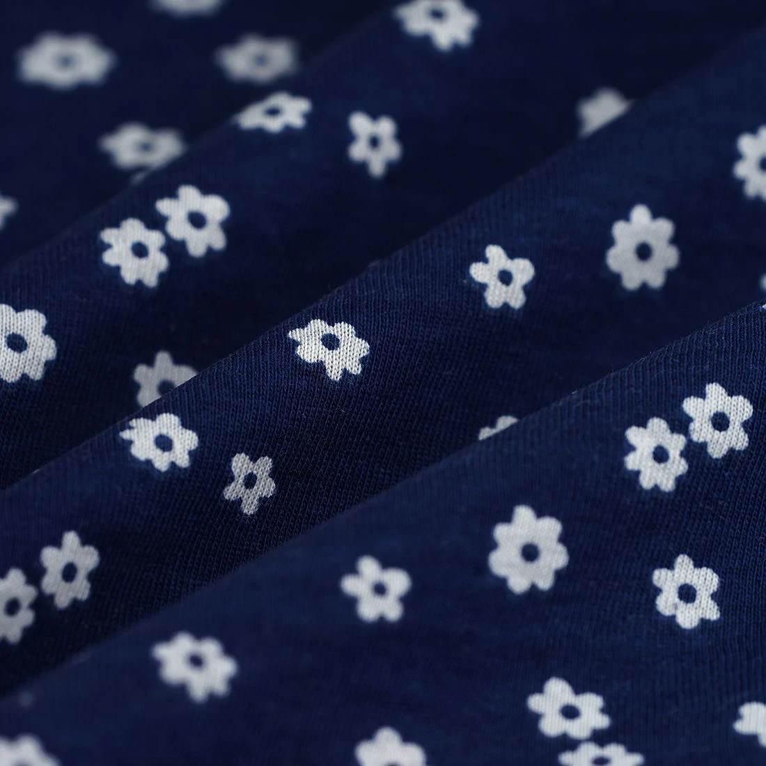 Wir sind begeistert von diesem entzückenden Baumwolljersey-Stoff mit seinen kleinen weißen Blüten auf einem blauen Hintergrund.