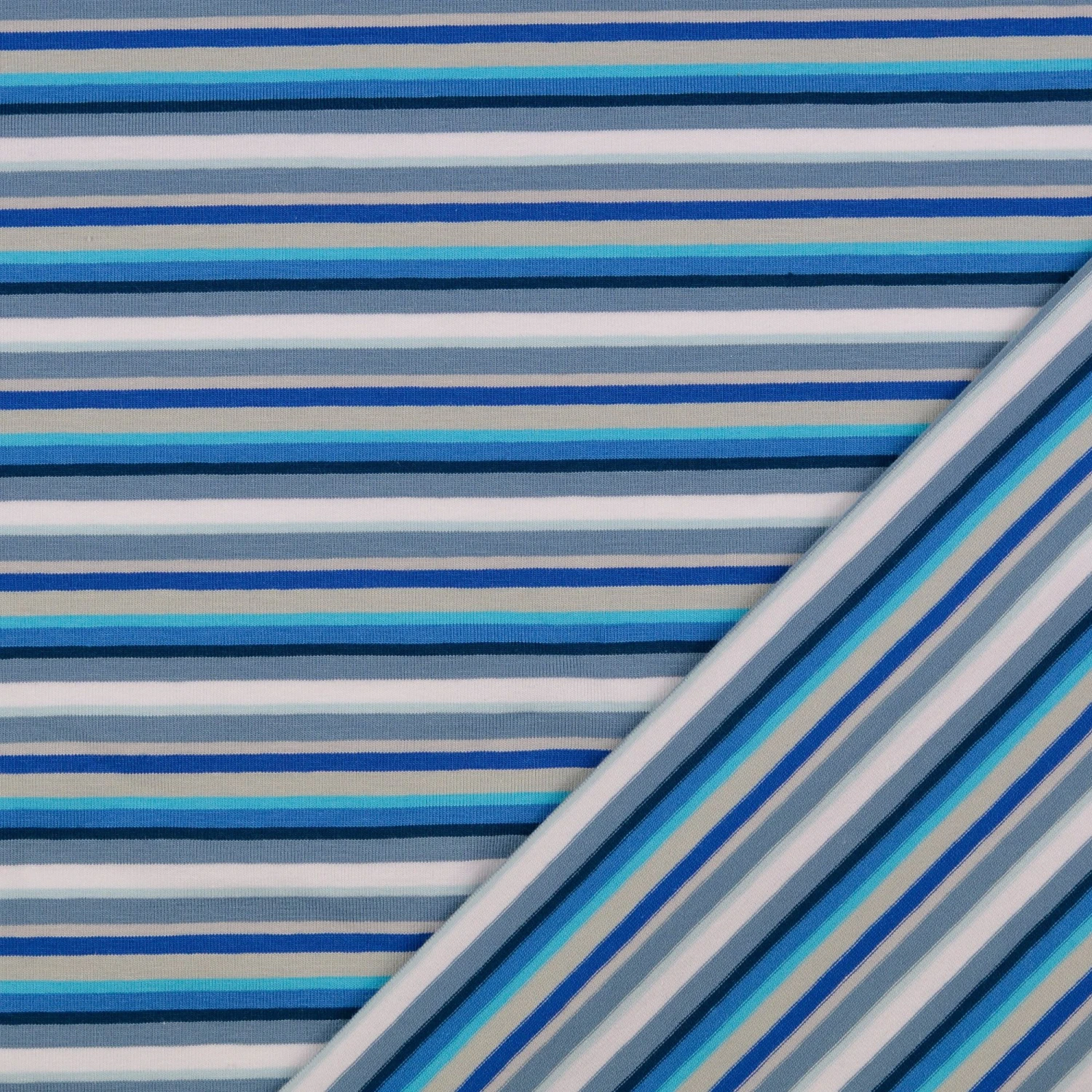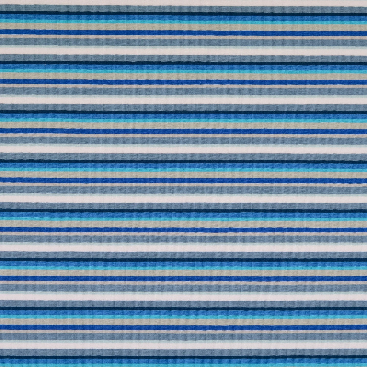 Dieses blau gestreifte Baumwolljersey ist eine ideale Wahl für Liebhaber von qualitativ hochwertigen Stoffen. Mit seinem schweren Gewicht und seiner Zusammensetzung aus 95% Baumwolle und 5% Elasthan eignet es sich perfekt für T-Shirts und Sportbekleidung. Die Produktkategorie „Baumwolle, Jersey, Bekleidungsstoff, Neuheiten, Variantengruppen“ macht es zu einer vielseitigen Wahl, die für viele Nähprojekte geeignet ist. Mit seiner schönen blauen Farbe und den verschiedenen horizontalen Streifen ist dieser Stoff sowohl elegant als auch lässig. Sie werden es lieben, mit diesem Baumwolljersey einzigartige und bequeme Stücke zu kreieren.