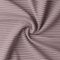 Wir freuen uns, Ihnen unseren neuen gestreiften Jersey-Stoff in Altrosa und Pflaume vorzustellen. Dieser Stoff ist zertifiziert und besteht zu 96% aus Baumwolle und zu 4% aus Elasthan, was ihn weich und dehnbar für optimalen Komfort macht.