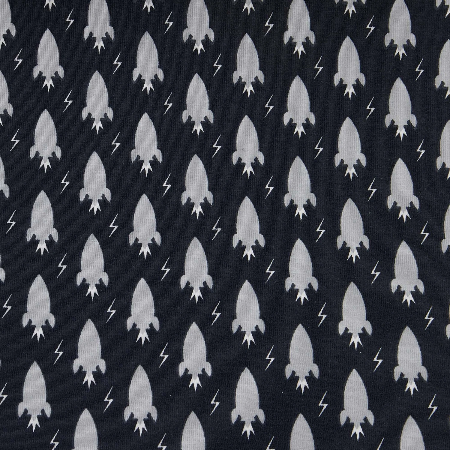 Das grau-schwarze Baumwoll-Jersey mit Raketenmotiven ist ein schwerer Stoff, der sich ideal für die Herstellung von bequemer und strapazierfähiger Kleidung eignet. Mit seiner Zusammensetzung aus 94% Baumwolle und 6% Elasthan bietet er eine hohe Flexibilität und eine gute Haltbarkeit im Laufe der Zeit. Dieser Stoff eignet sich perfekt für die Herstellung von Kleidern, T-Shirts, Sportbekleidung und Tops. Lassen Sie Ihrer Kreativität freien Lauf, um Ihren Stil zum Ausdruck zu bringen. Die Raketenmotive sind spielerisch und inspirierend und eignen sich ideal für Kinder oder Erwachsene, die Science-Fiction-Fans sind. Wählen Sie diesen Stoff, um Ihrer Garderobe eine lustige Note zu verleihen!