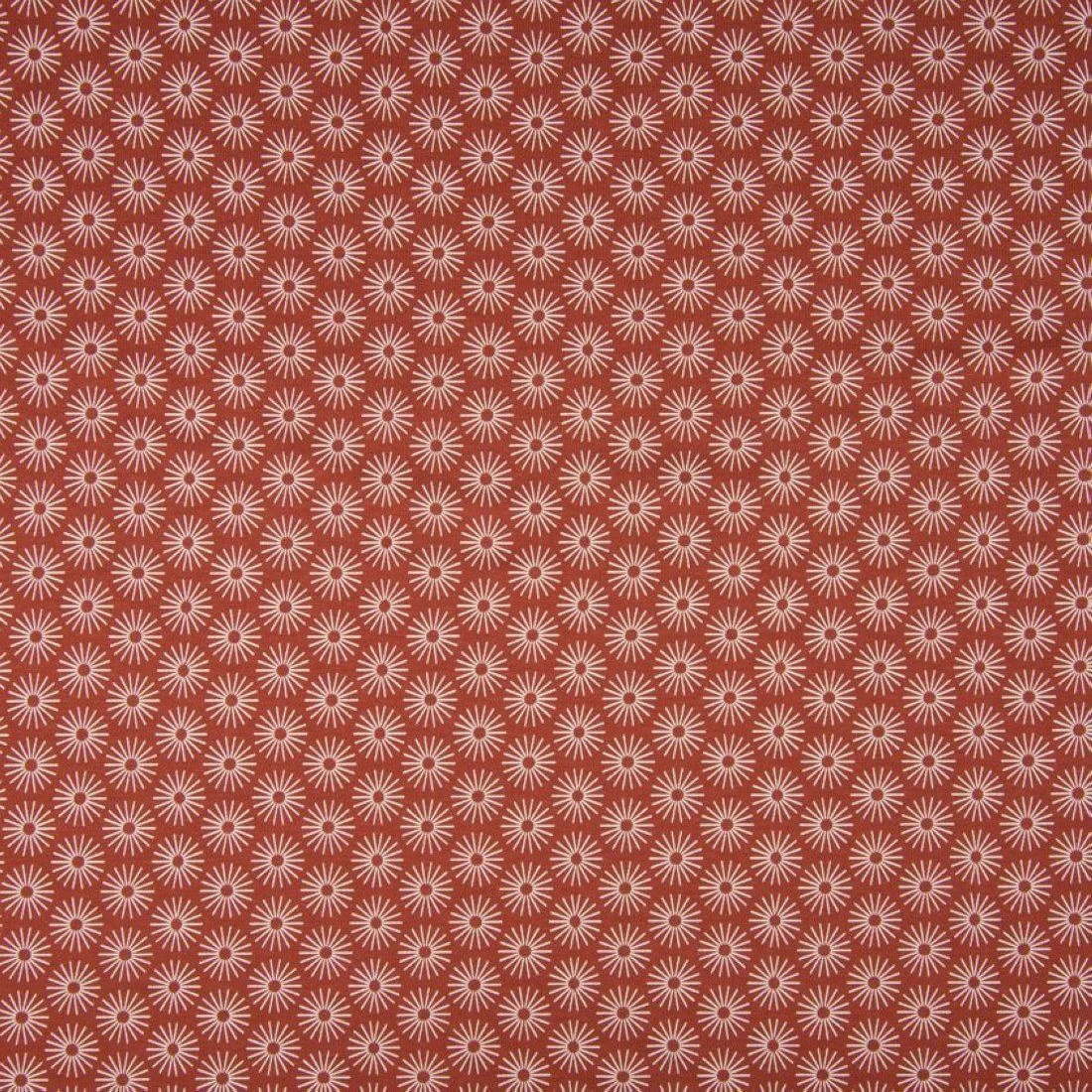 Baumwolljersey, bedruckt mit kleinen weißen Blumen auf terrakottafarbenem Hintergrund. Dieser Stoff ist ein gewirktes Gewebe, das für die Herstellung von T-Shirts verwendet wird. Sie können damit auch Röcke oder Kleider anfertigen. Fühlen Sie sich frei, Ihre T-Shirts durch Hinzufügen von Spitze, einer kleinen Tasche, einem farbigen Schrägband oder Knöpfen zu individualisieren.