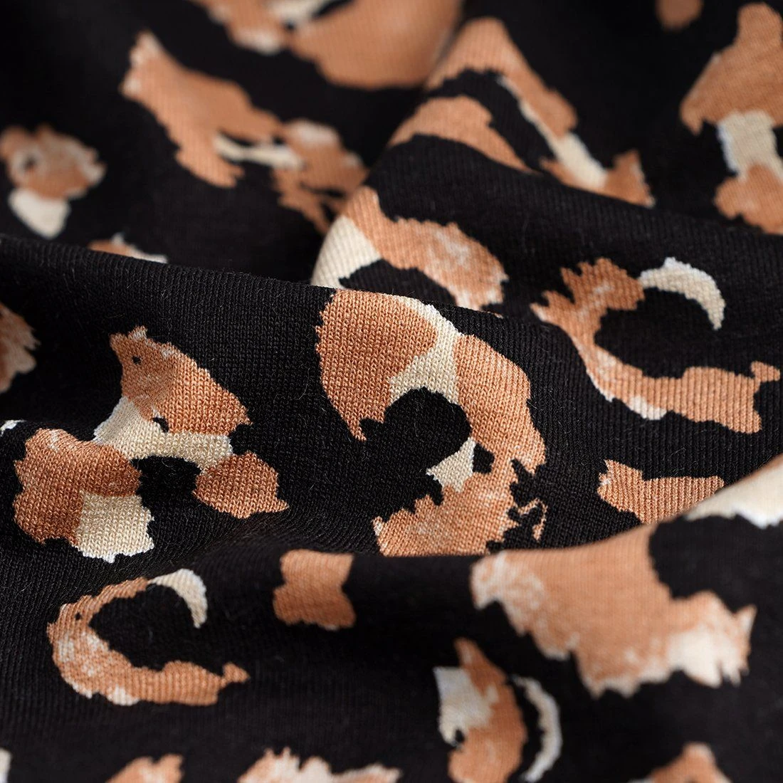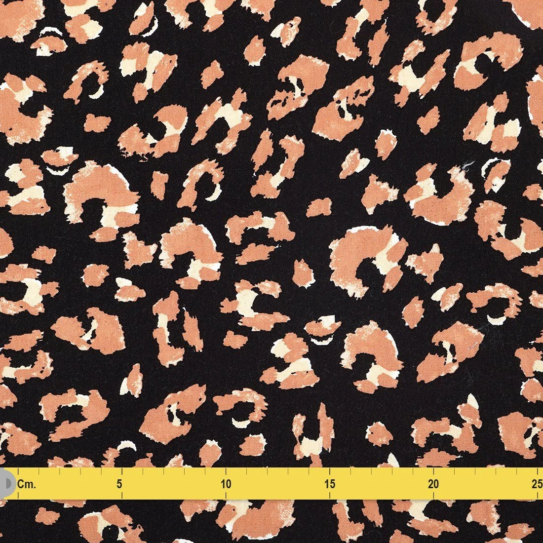 Eleganter Jersey aus Viskose mit schönem Leopardendruck auf schwarzem Hintergrund. Dieses farbenfrohe Material mit 5 % Elasthan ist flexibel und dehnbar und lässt sich gut für T-Shirts, Tops, Kleidern und Röcken verwenden.