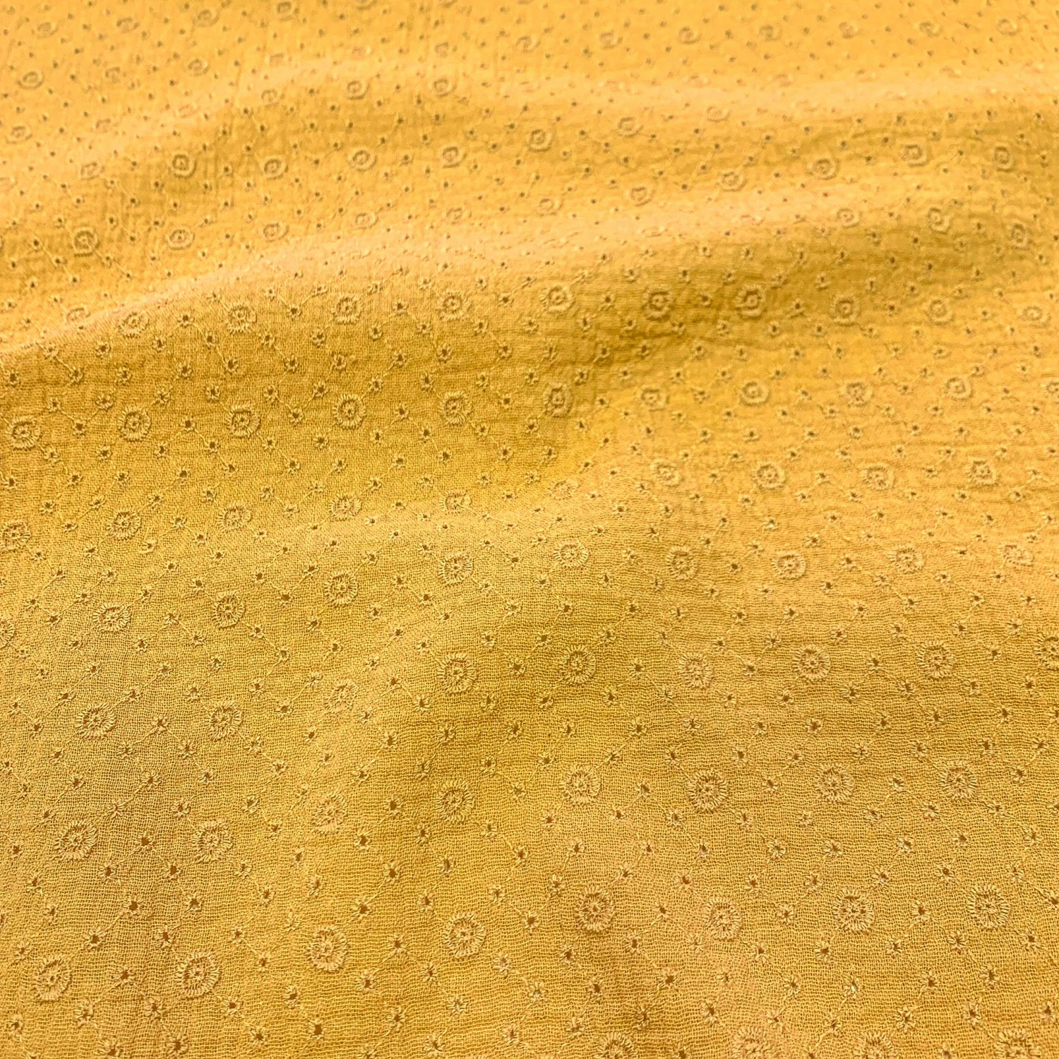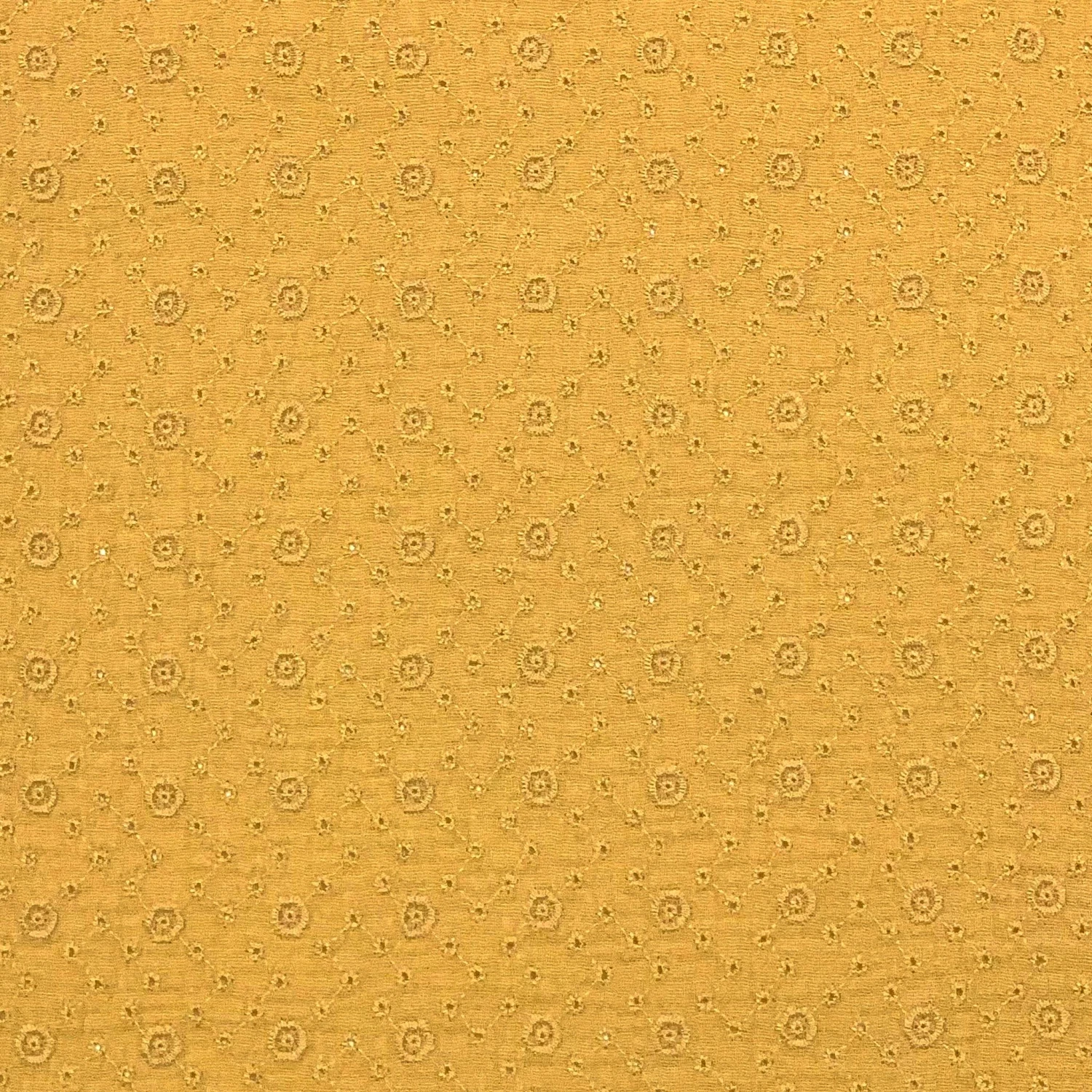 Verleihen Sie Ihren Kreationen mit diesem wunderschönen Musselin mit geometrischen Blumenstickereien in Senfgelb einen Hauch von Sonnenschein. Mit seiner 100%igen Baumwollzusammensetzung eignet er sich perfekt für die Herstellung von Nachtwäsche wie Bodys oder Pyjamas, aber auch für Accessoires, Kleider oder Tops. Wir lieben die geometrischen Blumenstickereien, die jedem Ihrer Nähprojekte eine originelle Note verleihen. Verwirklichen Sie Ihre Ideen mit diesem hochwertigen Stoff.