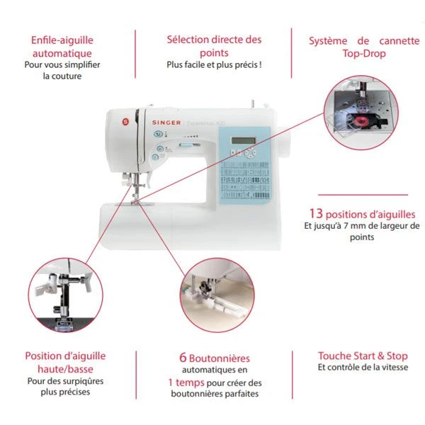 Mit 98 Stichprogrammen, darunter 9 Grund-, 8 Stretch- und 76 Dekorstichprogramme, lässt diese Maschine Ihrer Kreativität freien Lauf! Die Singer Experience 400 macht Ihnen das Leben leichter: automatischer Nadeleinfädler, direkte Stichauswahl, Top-Drop-Can-System, … Ihre Kreationen werden dank der Hoch-/Tiefstellung der Nadel und der 13 Nadelpositionen für präziseres Absteppen einem Profi würdig sein. Durch die Start & Stop-Funktion und die Drehzahlregelung wird das Risiko von Fehlern reduziert. Sie möchten perfekte Knopflöcher erstellen? Das ist mit dieser Nähmaschine und ihren 6 automatischen Knopflöchern in 1 Schritt möglich.