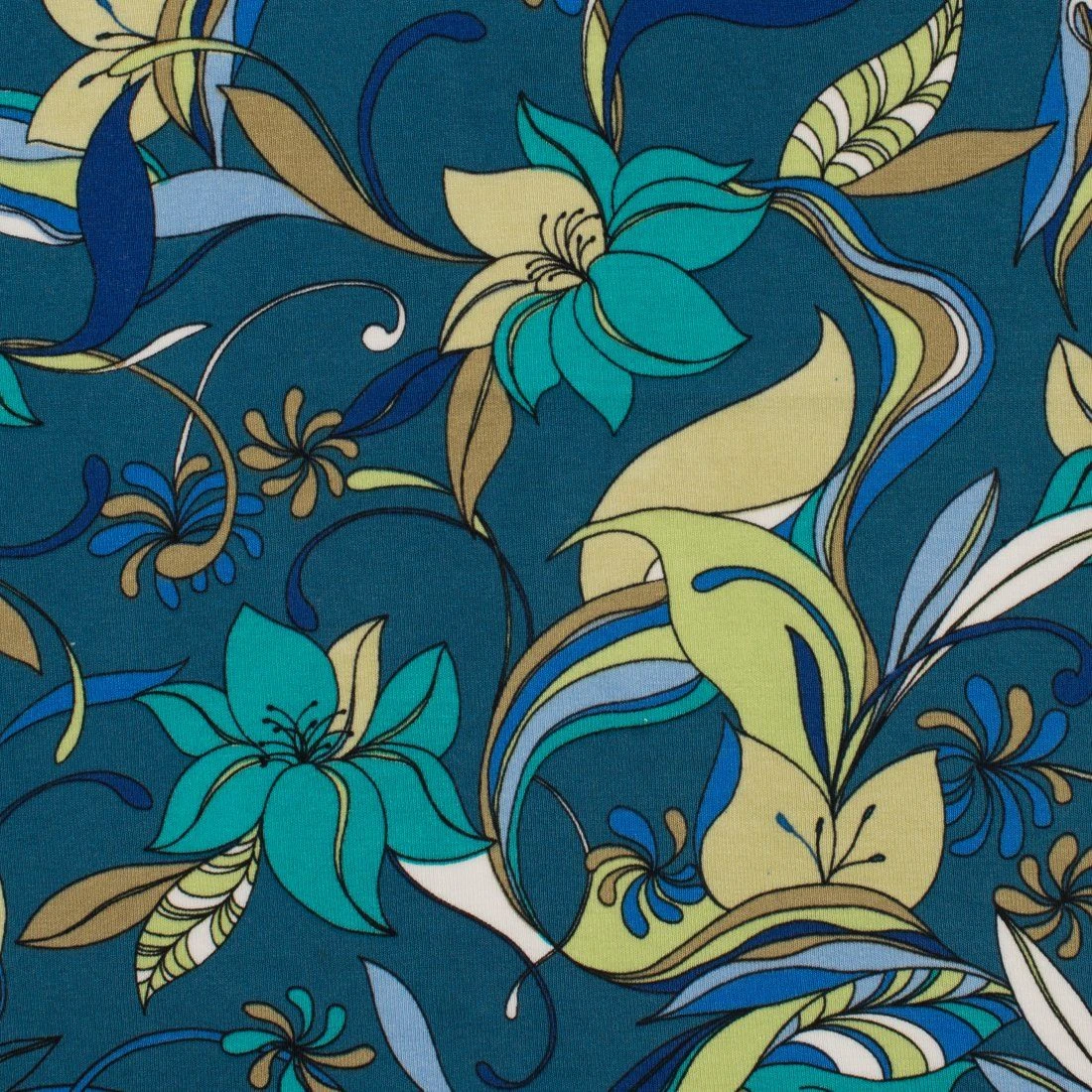Mit diesem Stoff können Sie ganz einfach ein Kleid, ein T-Shirt, einen Rock, eine Hose oder ein Oberteil kreieren. Das blumige Siebzigerjahre-Design in Blau ist einfach wunderschön und verleiht Ihren Outfits eine fröhliche Note. Also lassen Sie Ihrer Kreativität freien Lauf und fertigen Sie einzigartige und originelle Stücke mit diesem bedruckten Jersey-Viskosestrick in Blumenmuster im Stil der Siebzigerjahre in Blau an!