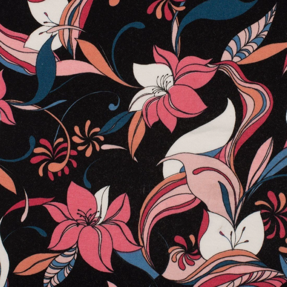 Dieser Strick ist perfekt für all Ihre Nähprojekte geeignet, sei es für die Herstellung von leichten Kleidern, bequemen T-Shirts, eleganten Röcken, lässigen Hosen oder trendigen Tops. Die siebziger Jahre Blumenmuster auf schwarzem Hintergrund verleihen Ihrer Garderobe eine Note von Raffinesse und Charme.