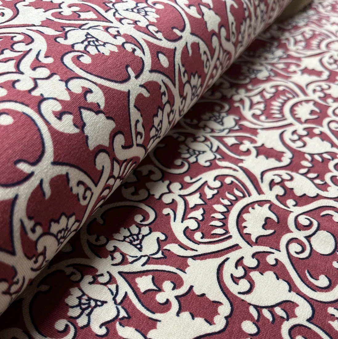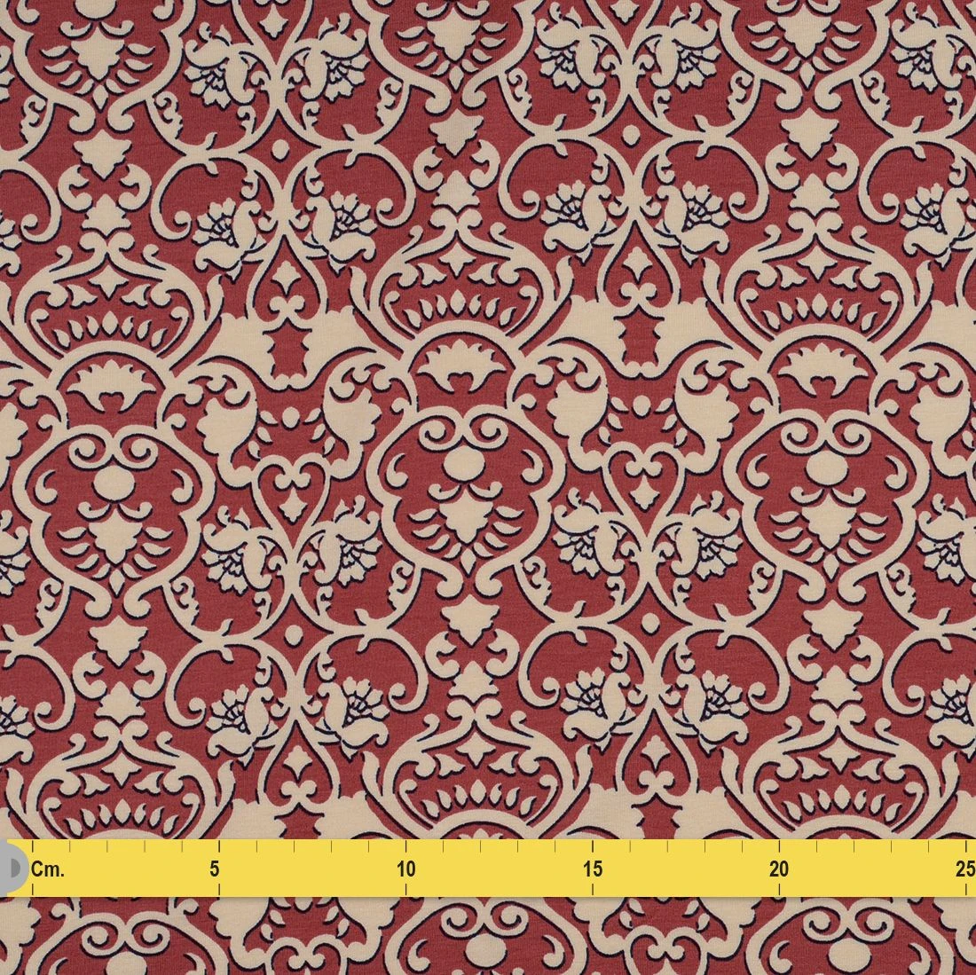 Entdecken Sie diesen wunderschönen Viskose-Jersey-Stoff mit ecru-farbenen Arabesken auf rotem Hintergrund. Mit 95% Viskose und 5% Elasthan ist dieser Stoff fließend und elastisch und hat einen schönen Fall. Dieser Strickstoff eignet sich ideal für die Herstellung von Oberteilen, T-Shirts, Röcken, Kleidern…